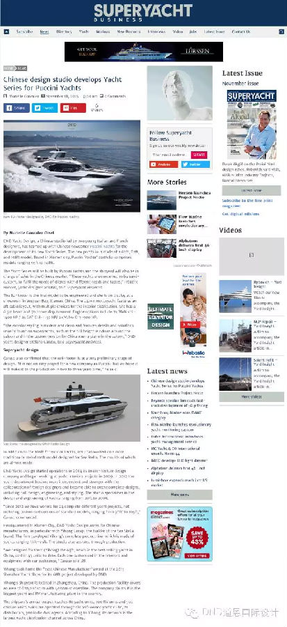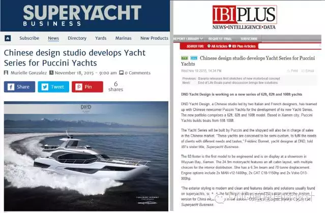 2015年11月18日,IBI PLUS和Superyacht Business发布了题为Chinese design studio develops Yacht Series for Puccini Yachts的文章,报道了DND道恩与普西尼俱乐部的合作,迈出了私人定制游艇系列的第一步。这也开启了全新的游艇定制模式,即设计直接对话终端客户,由市场主导新品开发的模式。DND道恩也成为在国外高端、专业媒体中曝光率最高的中国游艇设计公司。