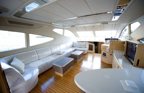由DND道恩设计公司设计的85尺豪华游艇,内饰选取的上乘木材,木纹完美,纯手工打造,皮革质感一流,软细纹真皮纯手工缝制。高强度顶级图层经过十几次的手工抛光,表面温润细腻,强度出众。