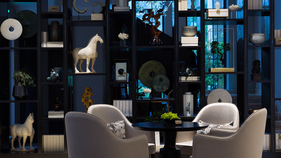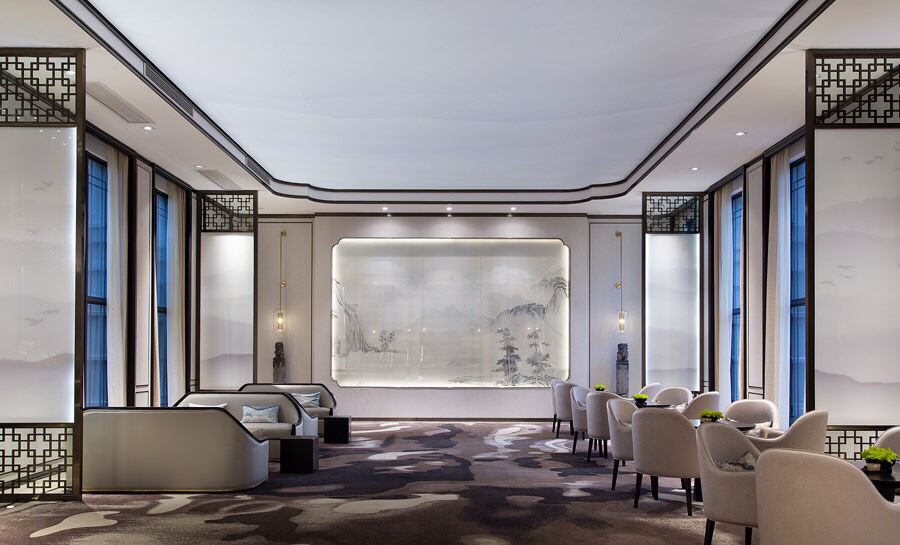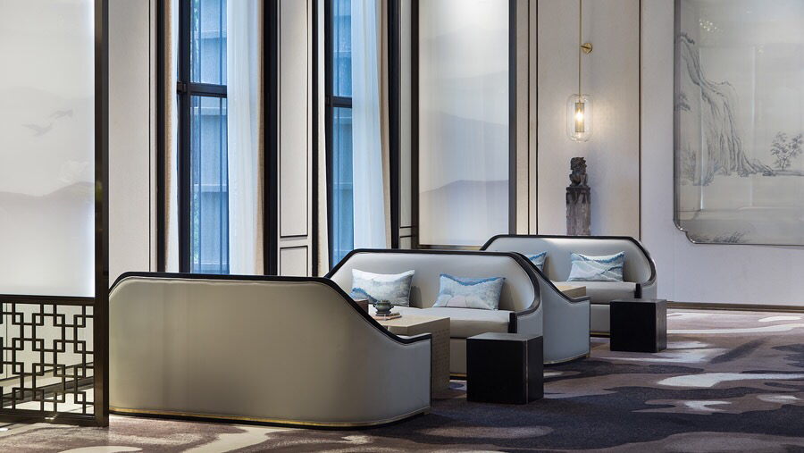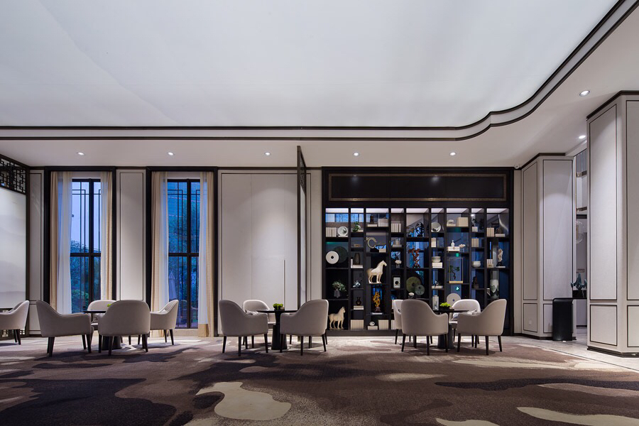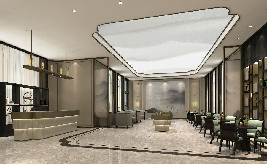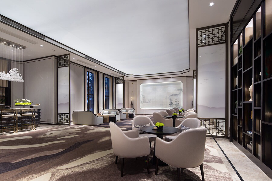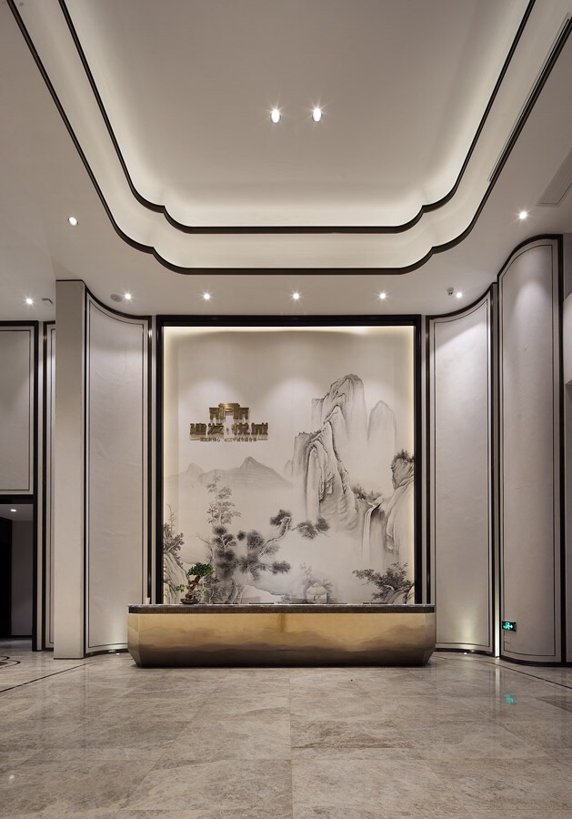 迎宾区采用新中式设计风格,表现形式简洁大气而不失细节,光影虚实、平行交错、巧妙地结合在一起,对比呼应,让整个区域别有情调。