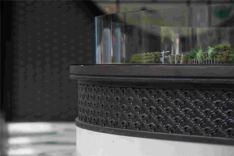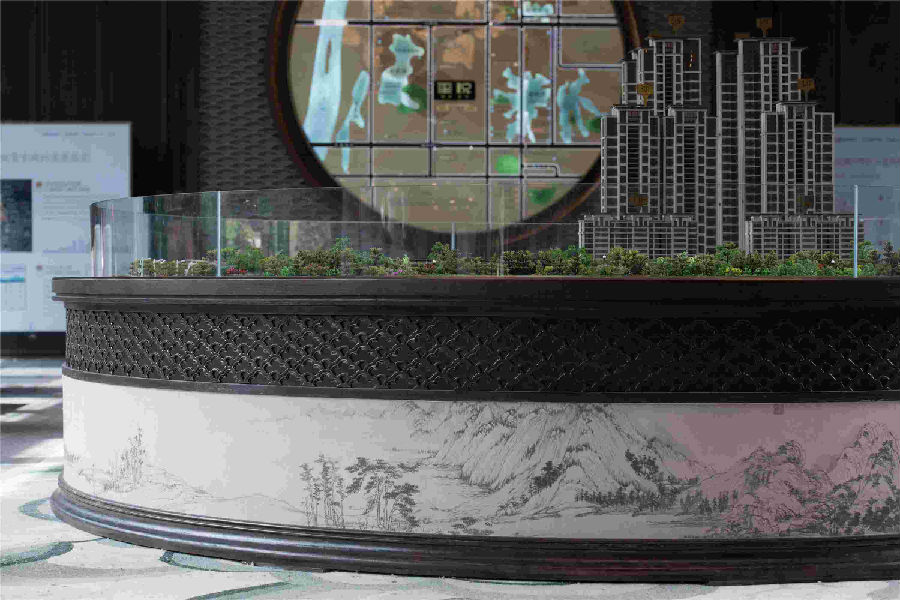 沙盘台周侧以名画“富春山居图”为装饰。鱼鳞纹元素的再次出现既丰富了台面细节,也对主要设计语言进行了点题。