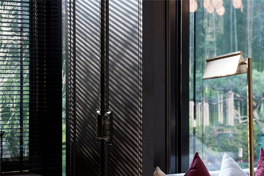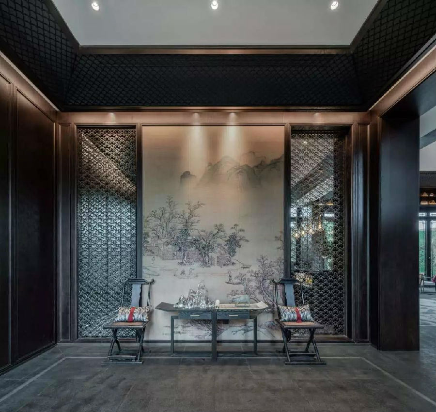大尺度的木饰屏风突显出中式气派。考究的铜雕装饰化简为奢,在光影映衬下又多了几分含蓄而富于层次的变化,冷静不失气度。