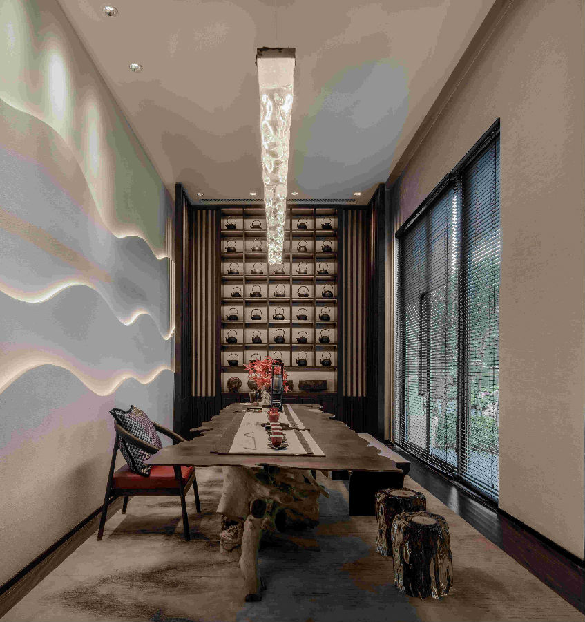 写意的长江水跃然墙上,在灯光照应下鲜活灵动,诠释出地域风采,为安定的心灵居所,添上一道自然活力。