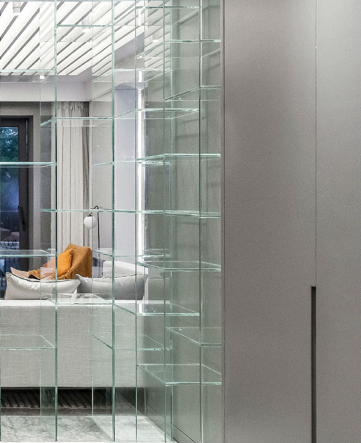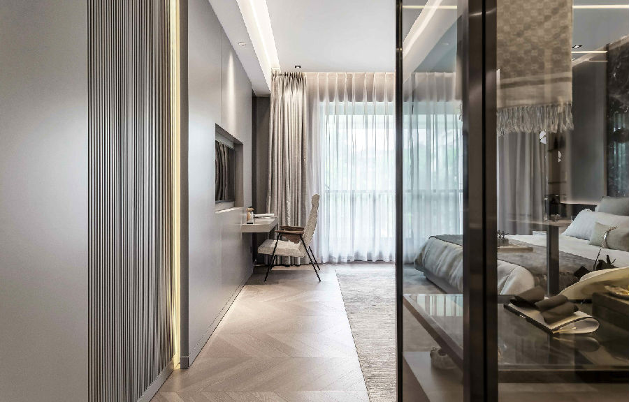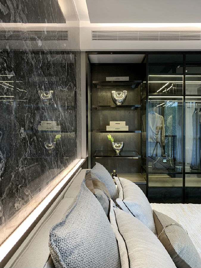 通透的灰色玻璃衣柜让有限的空间得到舒展。“高级灰”石材搭配天然的木质地面,添加了一份温润的高级质感。精心设计的