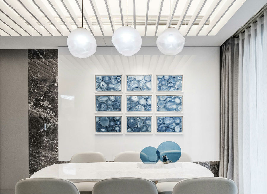 餐厅装饰吊灯与周围环境反射出浪漫轻松的气氛。吊顶与墙面的变化处理加上灯光的营造,丰富了视觉观感。蓝与灰的碰撞,