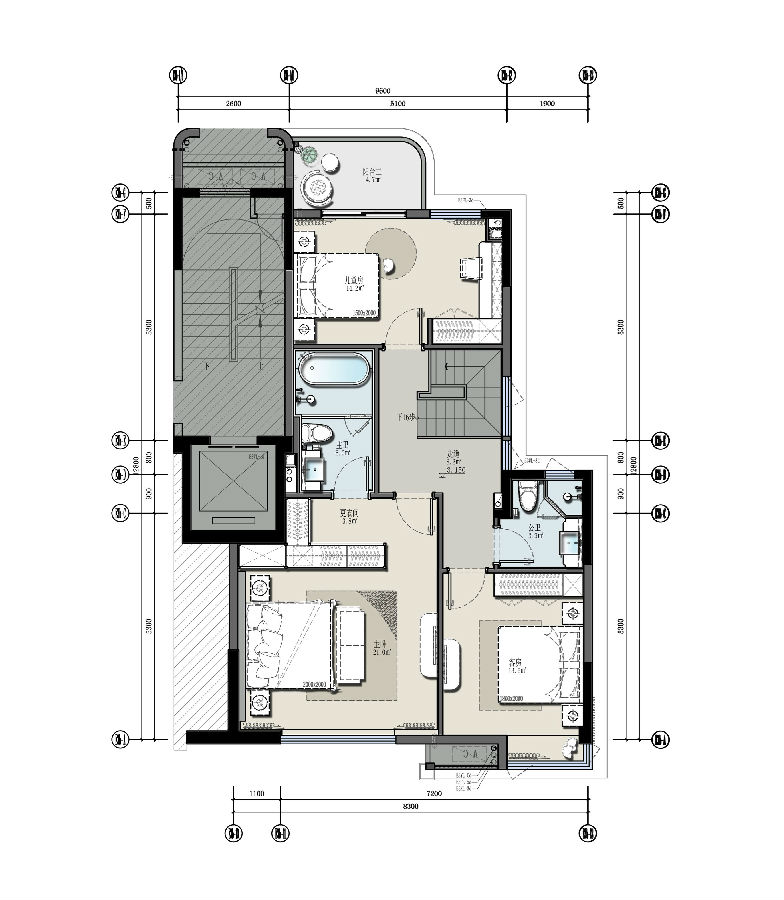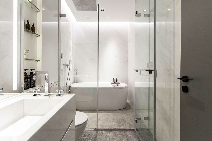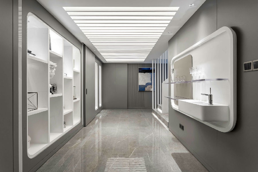 主卧洗漱间除了灰色基调,还多了些许“白”。在设计语言中,适度的留白,能降低杂质感,让空间简洁干净大气。