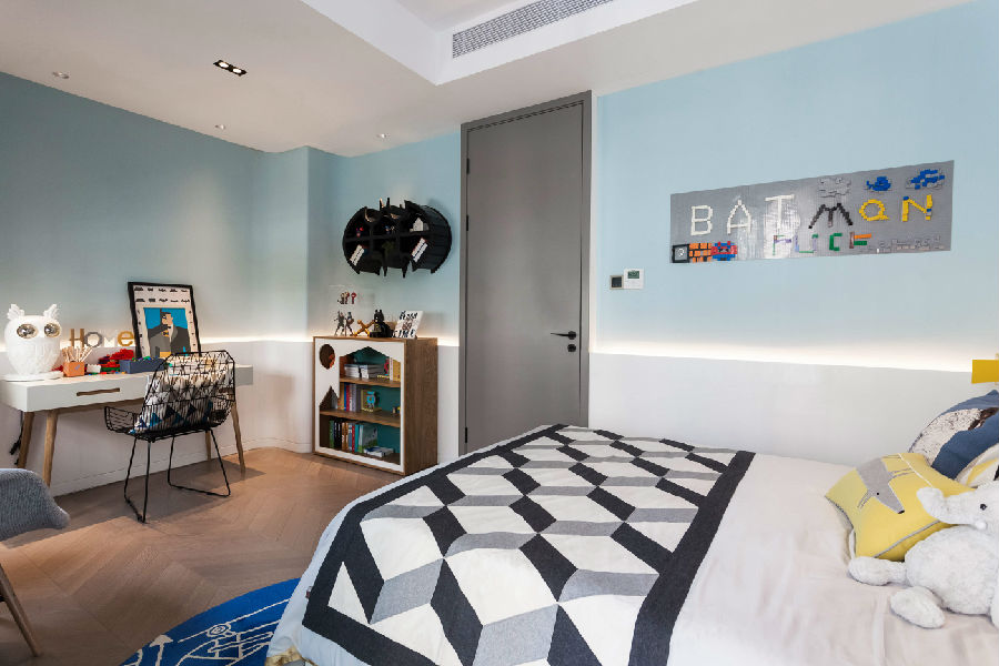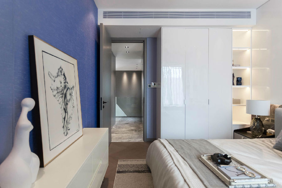 人们担心冷色调难以传递出家的温馨。其实,家的温馨在于家人。在主卧这个私密空间,设计师考虑的不仅是空间的合理使用,