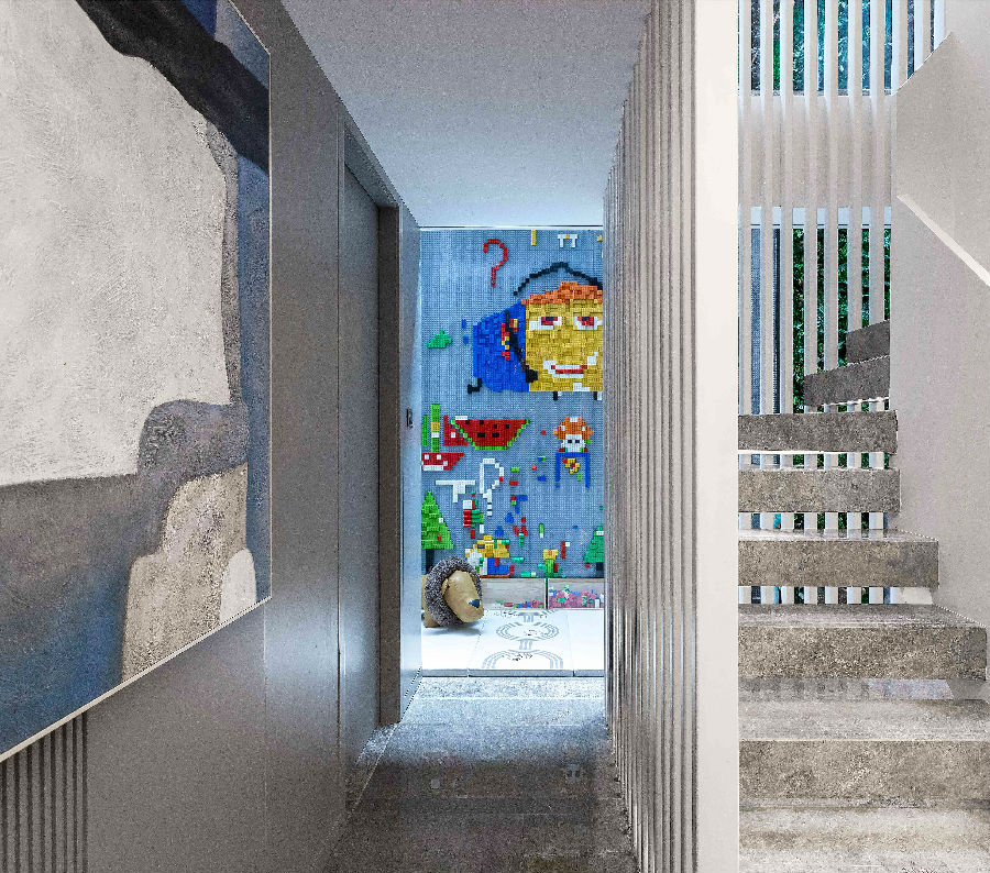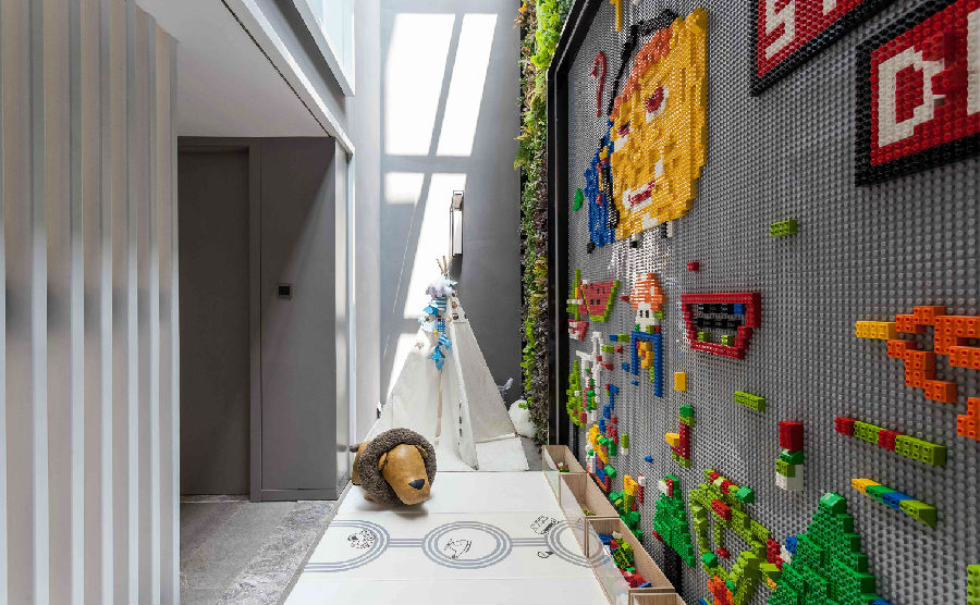 由超高挑空的采光井改造而成的儿童娱乐区,竖立着整面的乐高玩具墙,尽情释放孩子们的想象力。
